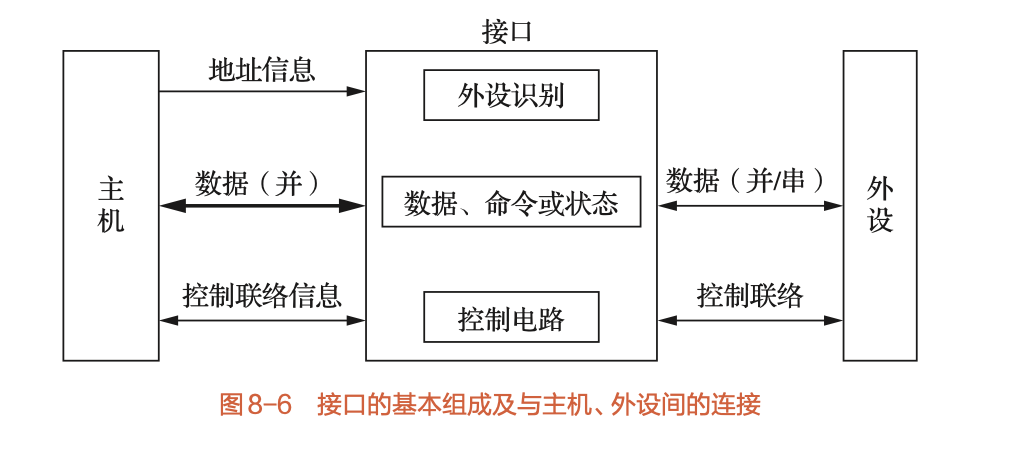 - 在主机和外设之间插入接口 (Interface),作为缓冲和转换的中介