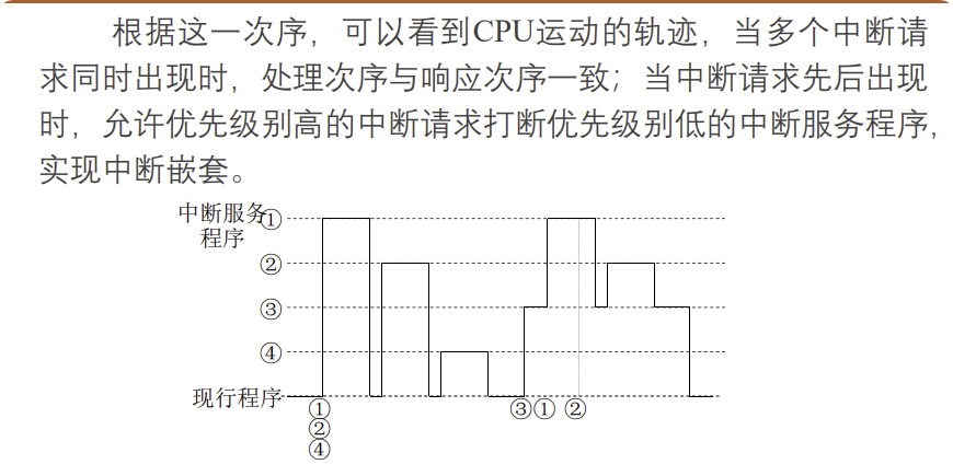 • 在多重中断轨迹图中,每次从"服务程序1"跳到更高优先级的"服务程序2"时,中间必须经过一次中断响应周期(隐指令),硬件会自动关中断、保护PC。